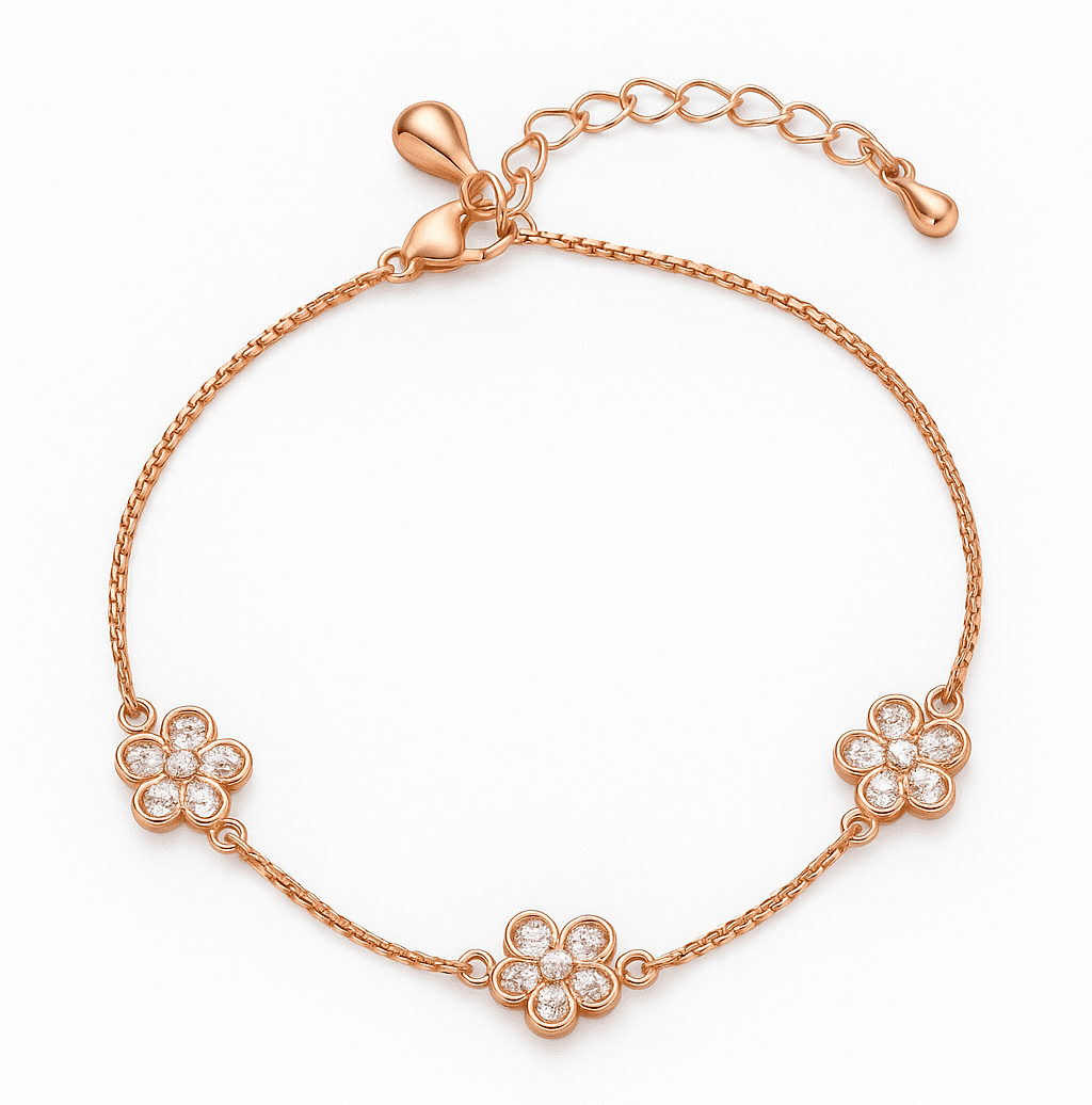The Blush Bloom bracelet is a graceful expression of elegance and warmth. Crafted in 925 sterling silver with a luxurious rose gold finish, it showcases three dainty flower motifs, each adorned with brilliant-cut stones that shimmer with every movement. The fine chain design ensures a lightweight, comfortable fit, while the adjustable clasp offers versatility. Perfect for romantic evenings or everyday elegance, this piece adds a soft, feminine glow to your jewelry collection.
