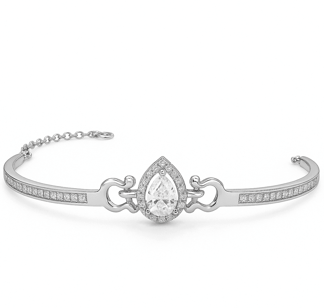 The Crystal Sovereign bracelet commands attention with its majestic teardrop-cut stone, framed by shimmering pavé diamonds and set in finely polished 925 sterling silver. The sleek metal band is adorned with delicate crystals, leading to an adjustable chain for the perfect fit.