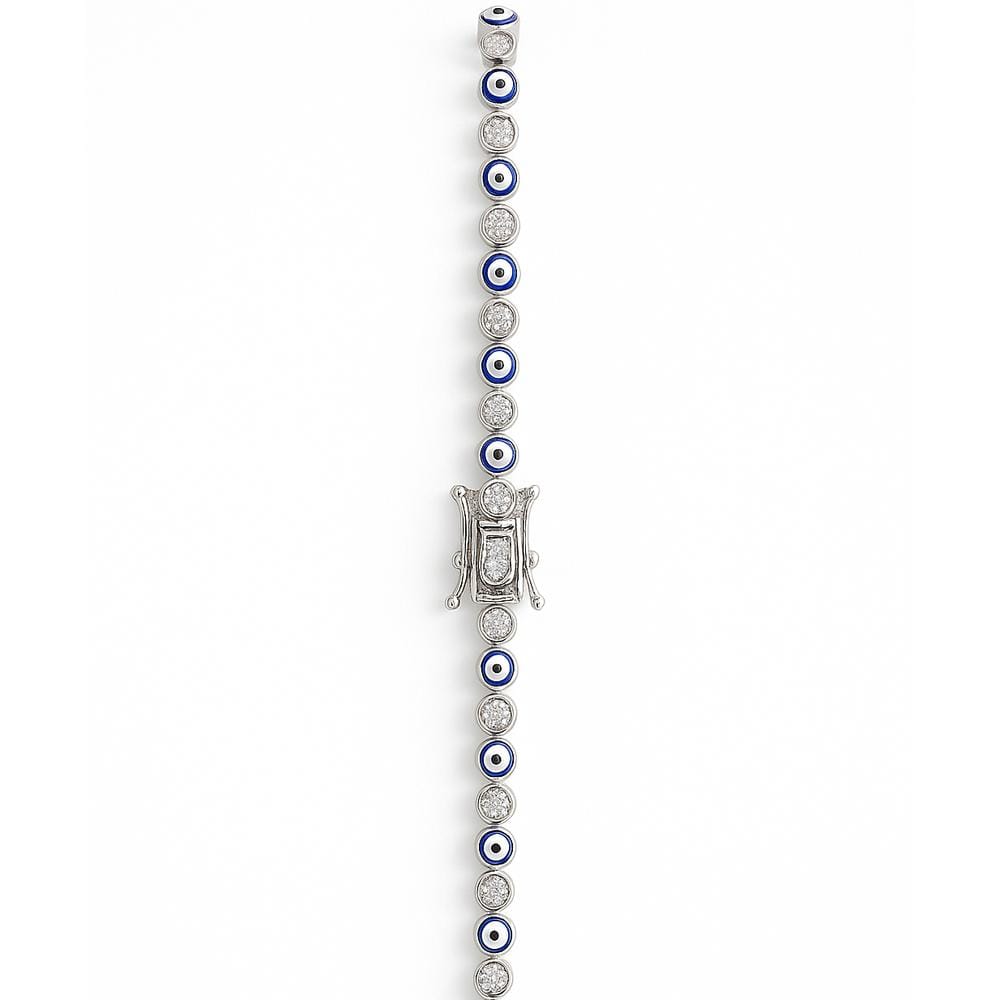 The Evilia Shield bracelet is where timeless symbolism meets luxury craftsmanship. Crafted from 925 sterling silver, it showcases a graceful alternating pattern of evil eye motifs and glittering pavé-set circular links, offering protection and sparkle in every glance.