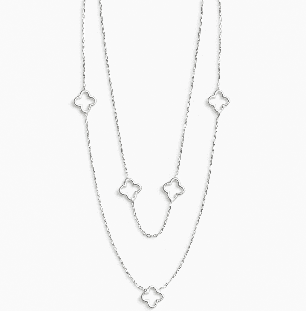 A double-layer silver chain featuring open clover motifs—minimal, modern, and perfect for effortless layering.