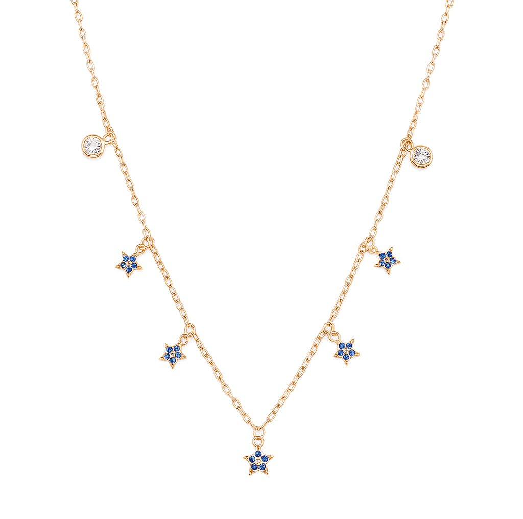 A whimsical gold-plated chain featuring sapphire-blue star charms and crystal accents—sparkling like a night full of wishes.