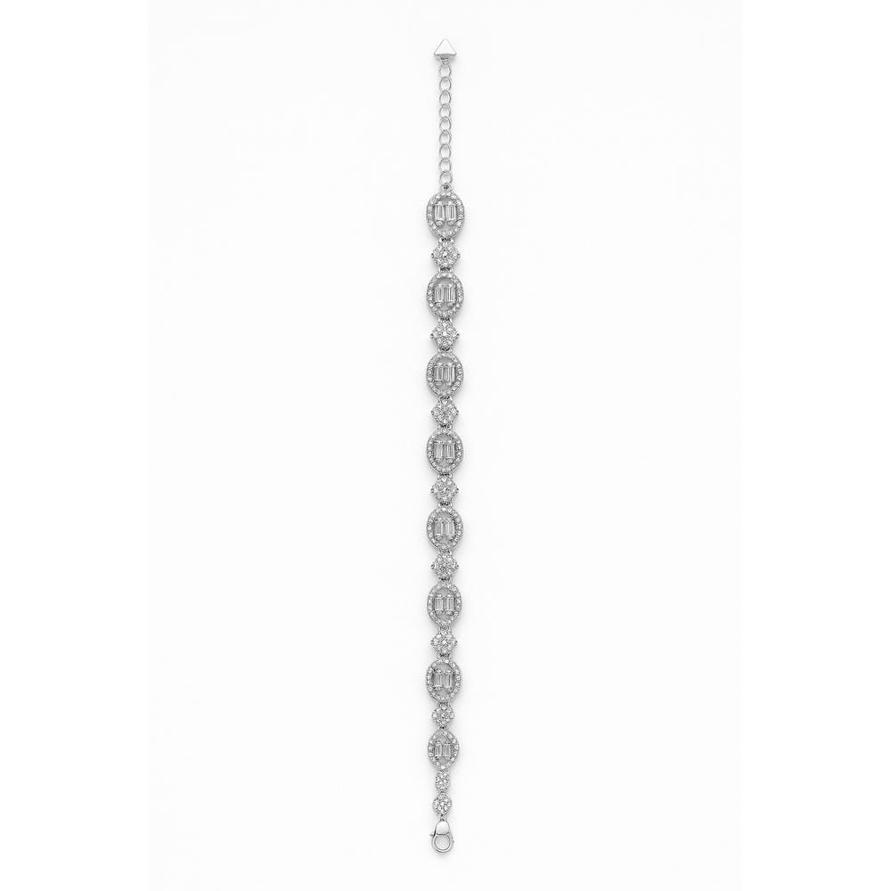 The Regalia Halo Bracelet brings together grandeur and delicacy with its alternating oval and floral motifs, intricately crafted in 925 sterling silver. Each oval link showcases a cluster of baguette-cut and round stones, perfectly haloed with a fine line of shimmering crystals, offering a rich and radiant appearance.