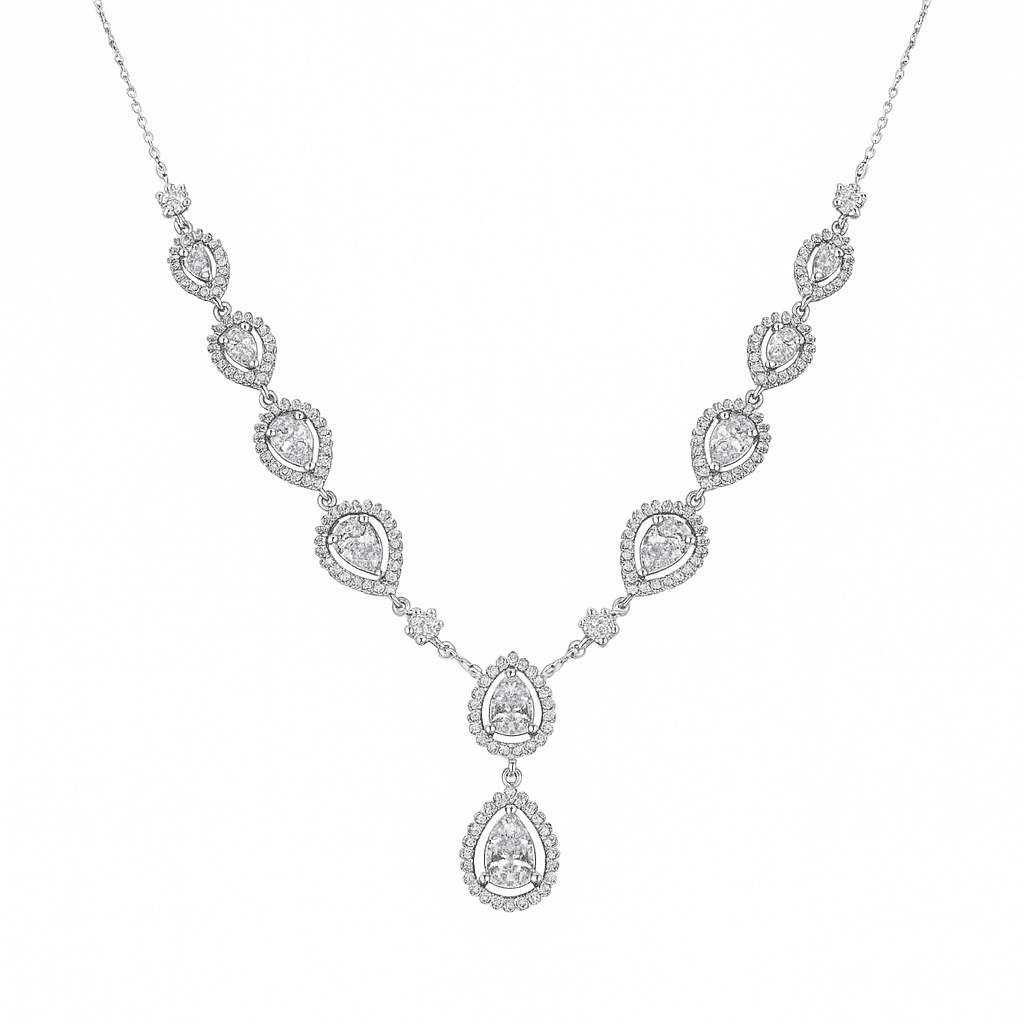 The Tear of Elegance Set exudes refined sophistication with every shimmering detail. This stunning jewelry set includes a statement necklace and coordinating drop earrings, each adorned with exquisite pear-shaped stones encased in pavé halos. Crafted from 925 sterling silver, the necklace features a flowing silhouette of teardrop elements that gracefully taper into a luminous centerpiece, while the earrings mirror this elegance with double-drop brilliance. Ideal for bridal occasions, celebrations, or regal evenings, this set captures the essence of timeless beauty and radiant charm.