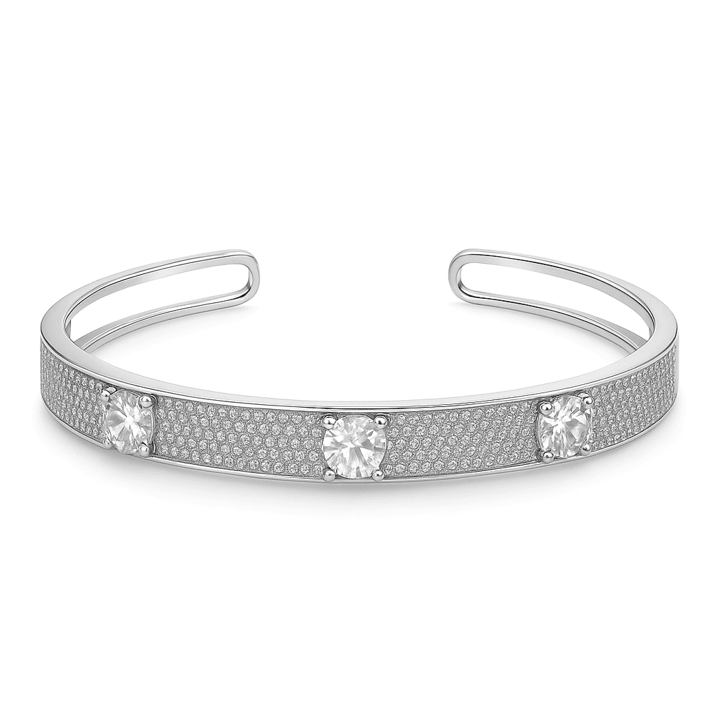 The Triara Luxe Cuff is a bold reinterpretation of elegance. This open cuff bracelet is crafted in 925 sterling silver and features three high-polish solitaire stones set against a backdrop of intricately pavé-set CZs that enhance its brilliance from every angle.