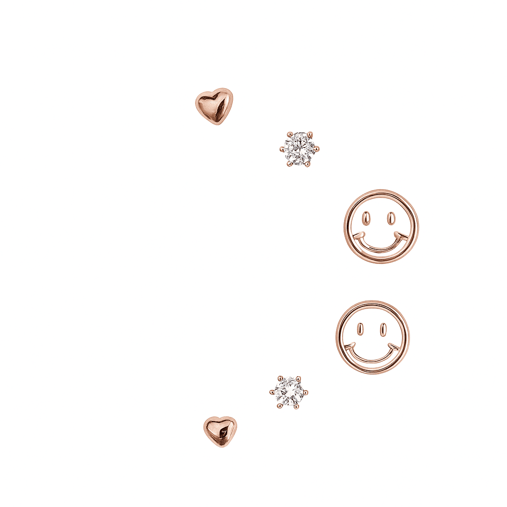 A charming trio of gold-plated studs featuring heart, crystal, and smiley face designs—perfect for mixing, matching, and layering everyday sparkle.